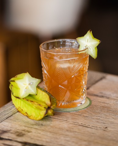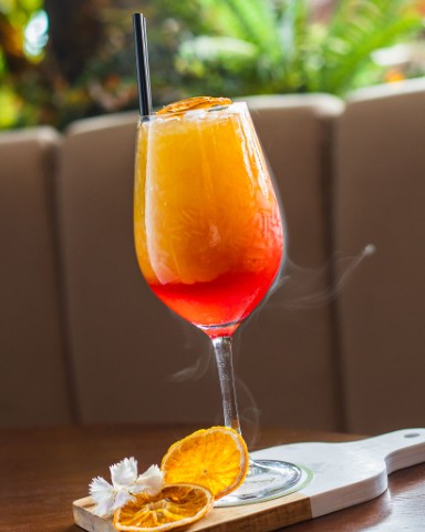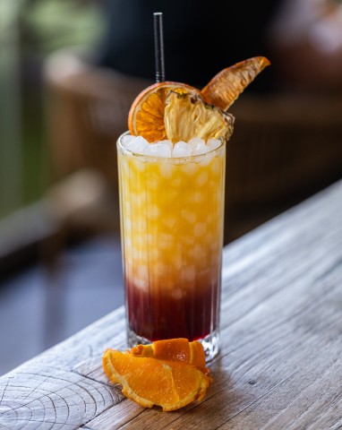 Orange juice, mango juice, pineapple juice, amarena syrup