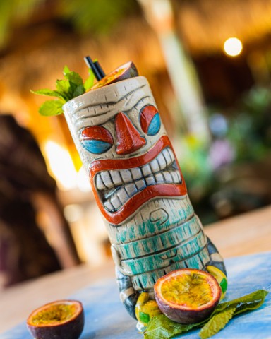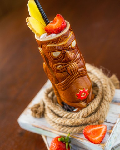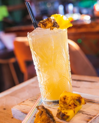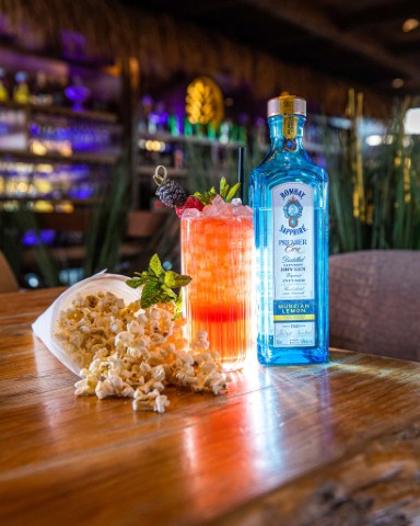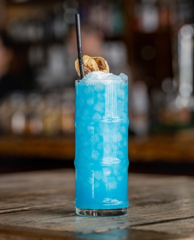 Cruzplata Tequila, Malibu, Blue Curaçao, natural lemon juice, coconut syrup and grated coconut.