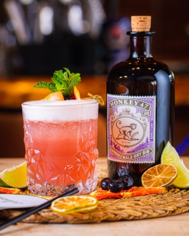 Monkey 47 Gin, Triple Seco, cranberry juice, natural lemon juice, yuzu puree and egg white.